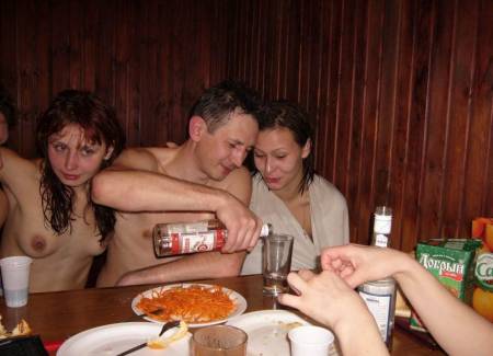 Описание: И снова пьянка в бане, веселая компания из девушек и парней неплохо попарившись в бане, голые решили раздавить пару бутылочек водки, рыженькая не плохо выпив и не думает скрывать свои титьки, а наоборот стала приставать к парням сидящим рядом